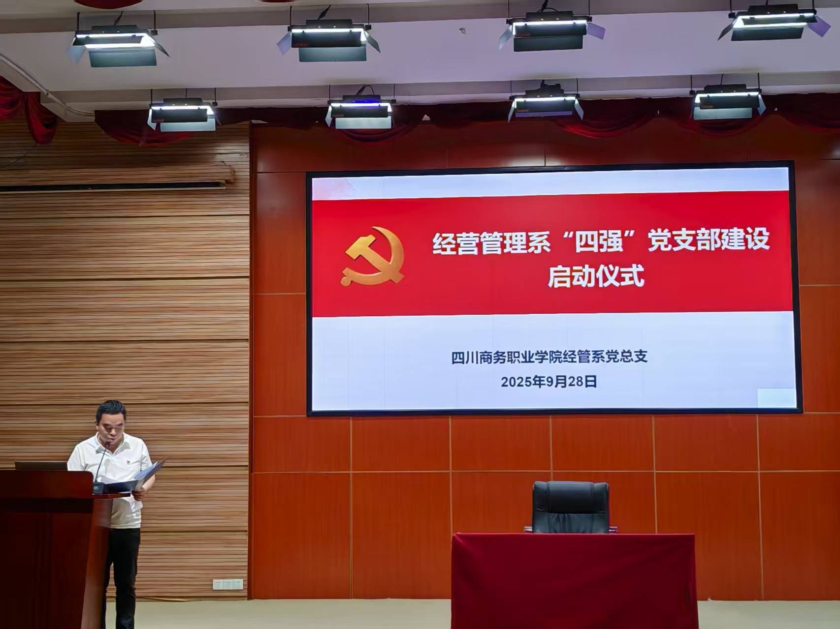 最后,举行了经营管理系 “四强” 党支部建设启动仪式。组织员李济民详细解读了系部 “四强” 党支部建设方案,从 “政治功能强、支部班子强、党员队伍强、作用发挥强” 四个维度,明确了建设目标、实施步骤与保障措施,为各党支部接下来的标准化、规范化建设提供了清晰指引。