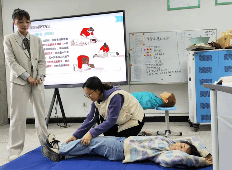 课程伊始,胡老师以社区真实心脏骤停救援案例为引,结合“黄金4分钟”的急救关键数据,深刻阐述了掌握心肺复苏术的重要性。在教学过程中,胡老师通过系统的理论讲解、清晰的标准示范以及直观的视频演示,引导学生逐步掌握胸外按压、开放气道等核心技巧。随后,学生们在老师的指导下,通过真人模拟互动与模拟人实操练习,实现了从知识认知到技能实践的有效转化。
