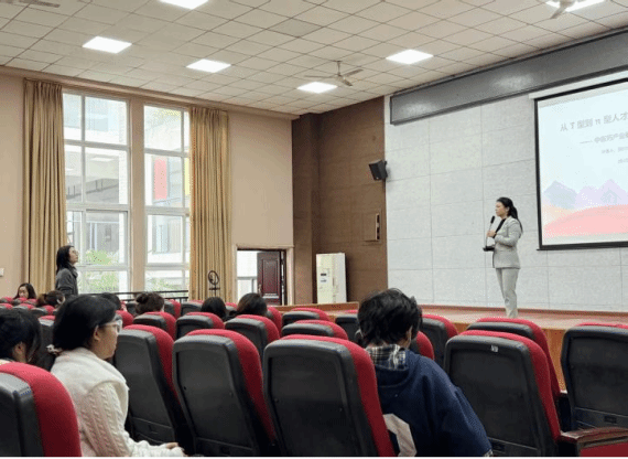 11月12日,经营管理系在第二学术报告厅成功举办“从T型到π型人才:新时代大学生的职业跃升之路”主题讲座。本次活动作为深化专业建设与行业对接、加强学生职业规划与就业促进工作的重要举措,特邀四川华鼎世纪中医药产业集团执行总裁杨兴群担任主讲。经营管理系主任王琦、药品经营与管理专业负责人王舒、就业干事杜灵芝、专业教师官晨、杜军,以及该专业2024级、2025级全体学生共同参与聆听。