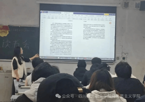 随后,活动进入交流与分享环节,现场气氛热烈。同学们依次发言,围绕经典著作和自身实际展开深入探讨:有人从“两个必然”出发,思考新时代青年的历史责任;有人围绕“人的自由发展”,探讨个人价值与社会发展的统一;还有人结合“共同体”理念,阐释了当代青年践行使命担当的现实路径。