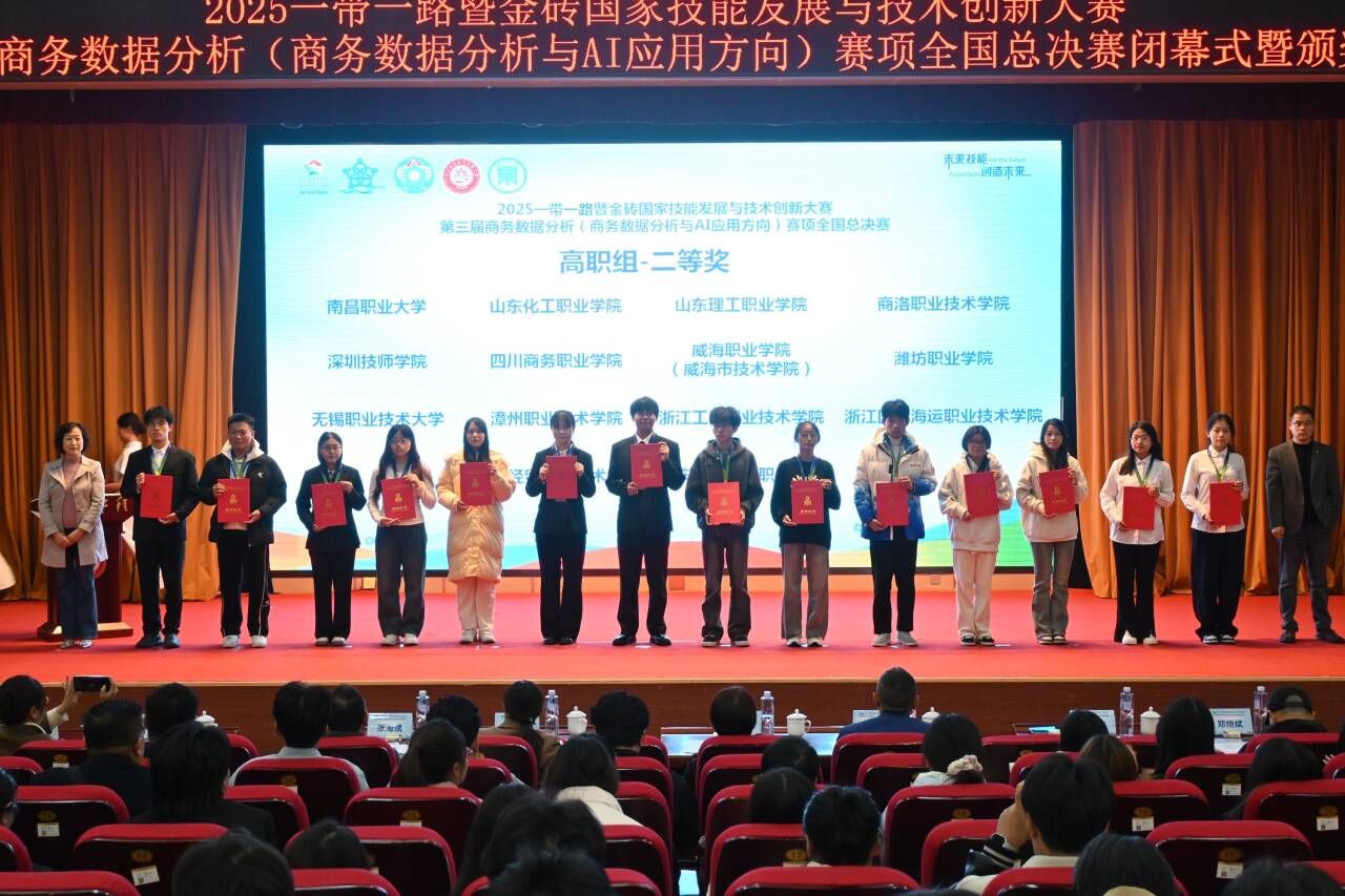 同期举办的“一带一路”暨金砖国家技能发展与技术创新大赛商务数据分析全国总决赛,深度融合人工智能与商业场景,重点考察选手的AI思维、数据分析能力与跨界应用水平。在李冰、高姗姗老师的指导下,大数据专业学生邹冰、左帅、韩忠宪组成的团队从全国700余支队伍中脱颖而出,凭借对模拟商业场景的高效解析与扎实的技术应用,勇夺全国二等奖。