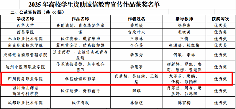 2025年四川省高校学生资助诚信教育主题活动评选结果正式公布:我院选送的参赛作品在全省千余部参评作品中崭露头角,斩获三等奖1项、优秀奖1项。这一成绩不仅是对获奖学生创作能力与诚信素养的高度认可,更印证了我院长期以来深耕资助育人领域、培育校园诚信文化所取得的显著成效。本次征集活动共收到各系报送的诚信主题作品40余部,作品形式多样、情感真挚,每一部作品都凝聚着同学们对“诚信”内涵的深刻解读、对资助政策的感恩之心,...