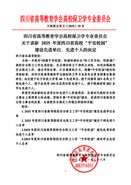 11月28日,四川省高等教育学会高校保卫学专业委员会发布《关于表彰2025年度四川省高校“平安校园”建设先进单位、先进个人的决定》,我院榜上有名,荣获集体与个人荣誉,实现“平安校园”建设领域的重要突破。学院被授予“2025年度四川省高等院校安全保卫工作‘平安校园’建设先进单位”,学院后勤保卫处处长何胜荣荣获“保卫干部先进个人”,后勤保卫处安保人员胡建勇、李玉梅荣获“优秀安保先进个人”,学生付琼祯荣获“学生先进个人”...