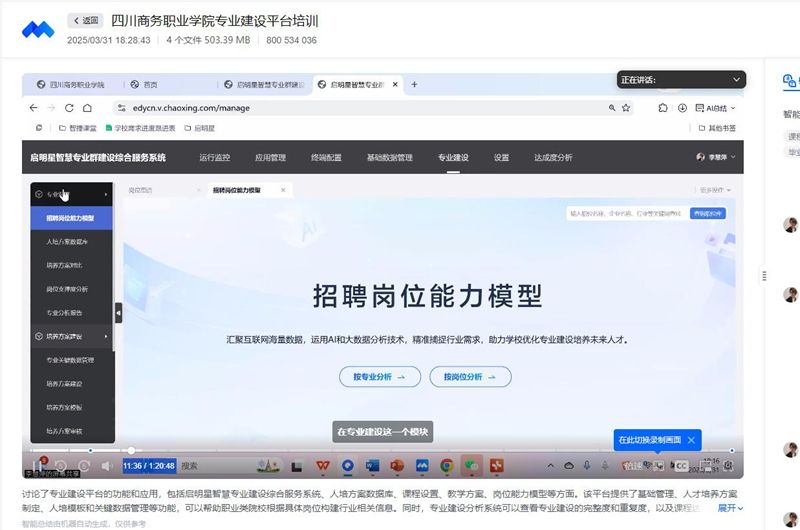 为推进高水平专业群建设,深化教育教学内涵发展,我院于2025年3月31日晚通过腾讯会议举办超星平台专业建设线上培训会,百余名教师参加。培训聚焦数字化工具在专业建设中的应用,超星专家重点讲解了四大功能:一是人才培养方案智能化管理,支持方案导入、数据分析和动态调整;二是课程标准全流程管理,实现线上协同修订;三是专业图谱可视化,直观呈现课程与能力的支撑关系;四是多维成果展示平台,集成专业建设成果。这些功能为专业认证、...