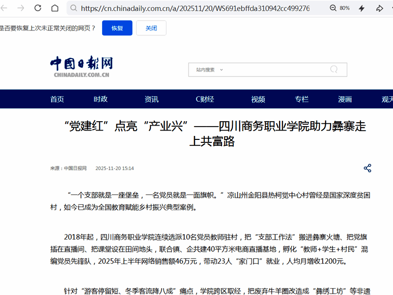 连日来,中国日报网、中国教育电视台两大国家级媒体聚焦四川商务职业学院,专题报道学院定点帮扶凉山州金阳县热柯觉中心村,创新打造“热柯觉模式”的生动实践。中国日报网的报道以《“党建红”点亮“产业兴”——四川商务职业学院助力彝寨走上共富路》为题,指出自2018年起,学院连续选派党员教师驻村,将党建工作深度融入乡村发展全过程,创新推出“支部工作法”,把党旗插在直播间、把课堂设在田间地头,积极探索“党建+产业”融合发展路径。...