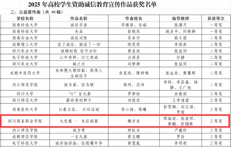2025年四川省高校学生资助诚信教育主题活动评选结果正式公布:我院选送的参赛作品在全省千余部参评作品中崭露头角,斩获三等奖1项、优秀奖1项。这一成绩不仅是对获奖学生创作能力与诚信素养的高度认可,更印证了我院长期以来深耕资助育人领域、培育校园诚信文化所取得的显著成效。
