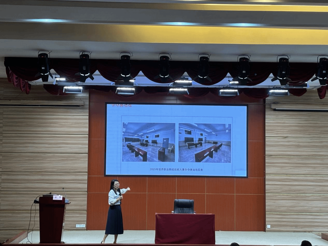 讲座中,徐蓓老师通过现场展示2025年世赛选拔赛场地实景、解读高职组世赛裁判对参赛选手的专业评价维度等内容,从选手选拔到沙盘推演,从现场处置到赛后复盘,手把手、点到点的讲解示范,场景真实、干货满满,让备赛内容更具象、更真切。在场师生专注聆听、认真记录,现场学习氛围浓厚,反响热烈。